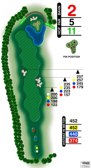 Gelb: 452 Meter, PAR 5, Handicap 7Gelb (bis 12/2013): 452 Meter, PAR 5, Handicap 11