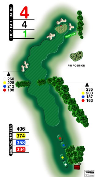 Gelb: 374 Meter, PAR 4, Handicap 5Gelb (bis 12/2013): 374 Meter, PAR 4, Handicap 1